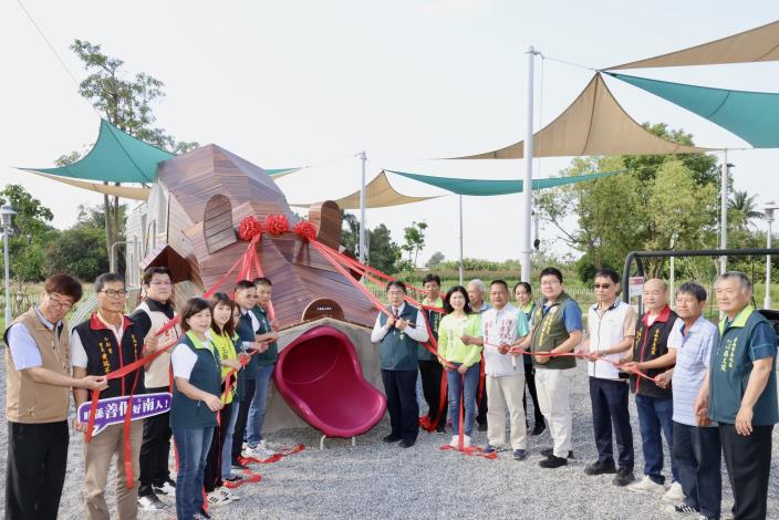 台南市兒童遊戲場再添新亮點!以善化在地文化—牛墟為主題的「善化區公六公園特色遊戲場」今(25)日正式啟用,善化區公所今日上午舉辦開幕儀式,現場吸引眾多親子家庭參與。市長黃偉哲與副議長林志展、議員陳碧玉等地方代表揭下牛隻主題遊具上的鍛帶,象徵牛墟交易時的「嫁妝」祝福,也見證這座充滿地方文化特色的兒童遊戲場正式對外開放。