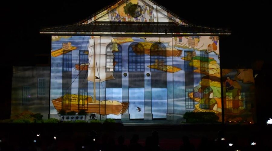 「耀啟•彰化行」台灣設計展光雕秀由彰化在地青年設計團隊-光滿樓股份有限公司規劃製作,運用國際級光雕投影技術,透過鹿港公會堂正面與兩側電腦投射的沉浸式投影,營造包圍的沉浸氛圍,結合高流明硬體投射設備,讓百年建築化身為巨型光影畫布,彷彿置身時光流動之中。光雕秀如同翻閱一本會發光的歷史圖卷,宏觀壯闊而細膩動人,全方位展現文化自信,讓每一位觀眾能感受到彰化的獨特魅力。