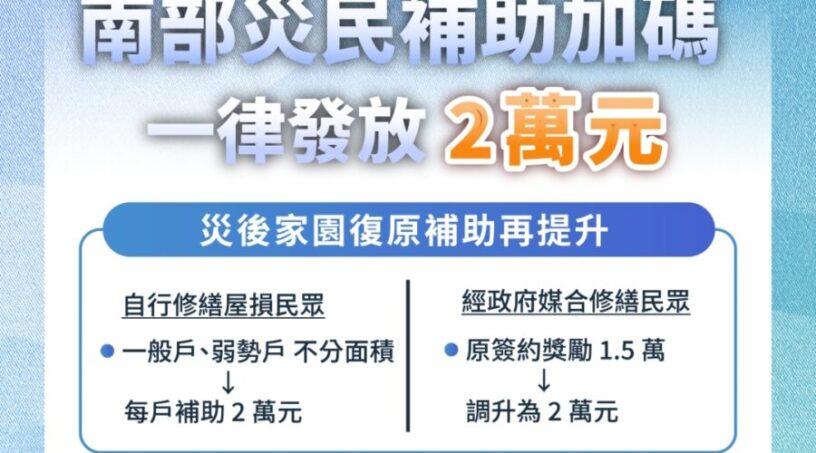 為協助丹娜絲颱風及七二八豪雨災民加速重整家園,內政部今(10)日表示,行政院已於11月6日核定修正丹娜絲風災家園復原補助金專案,凡是未參加政府媒合修繕平台、自行修繕屋損的災區民眾,包括一般戶及弱勢戶,不分面積一律都發2萬元補助,另在今(114)年9月3日至10月6日期間,由政府媒合簽約修繕的民眾,原1.5萬元的簽約獎勵金也一併同步調整至2萬元。