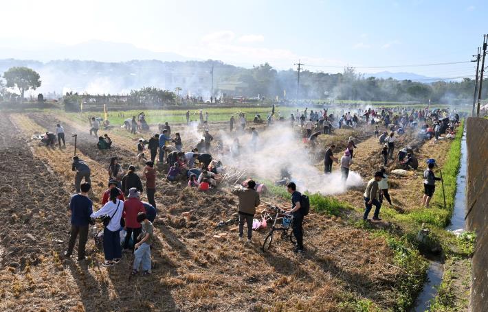 頭份市公所與農會連續第21年舉辦「焢窯」烤番薯活動,今年輪值到廣興里承辦,上千位鄉親一早就走入苗5-2線高速公路涵洞側的農田,有人從小烤番薯到成年,有些是一家三代全家總動員,享受難得的親子家庭日。