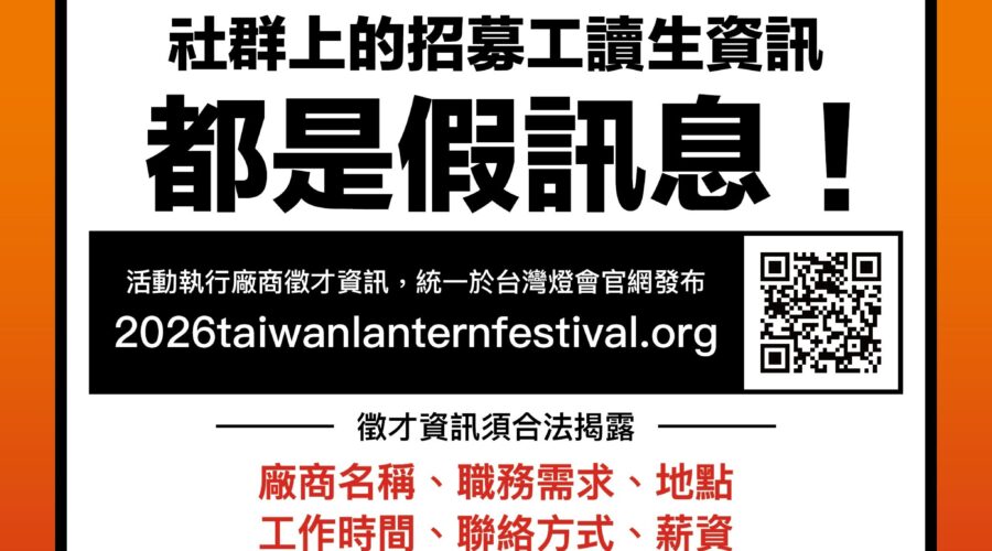 縣府指出,「2026台灣燈會」所有正式徵才資訊,僅會透過「2026台灣燈會官方網站」 https://2026taiwanlanternfestival.org/ 統一公告,不會透過私人社群帳號、不明連結或非官方表單進行徵才。