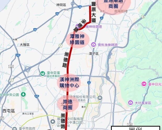 捷工局說明,崇德豐原線初步規劃採高架形式,全長約15.42公里,規劃設置11座車站,路線自北屯區崇德路與三民路口向北延伸,行經崇德路、承德路、豐原大道至中正路一帶,並納入銜接豐原車站之路段,以強化豐原市中心與豐科園區間的交通服務。依目前推估,至目標年(民國140年),主線500公尺範圍內服務人口約22萬人,尖峰時段班距可達2.5分鐘,有助於提升通勤效率並改善整體交通流量。