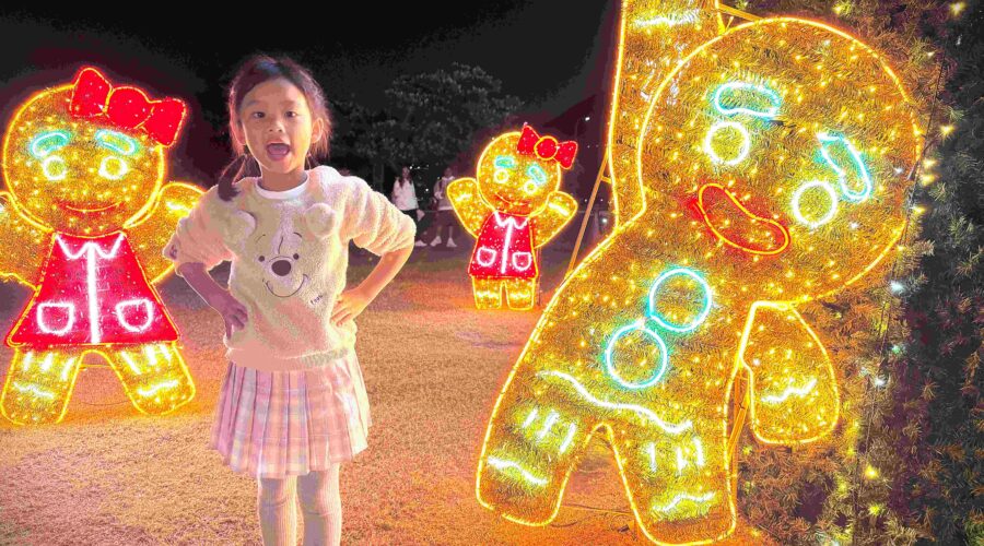 走進淡水捷運站後方的金色水岸,首先映入眼簾的是今年最具甜蜜氣息的主題燈區「光聚甜心時光」,以高達 8 公尺的聖誕樹為主角,搭配環繞周邊的薑餅人守衛隊光雕與繽紛暖色燈光,營造洋溢幸福感的節慶氛圍,成為情侶、親子與好友拍照打卡的熱門亮點。