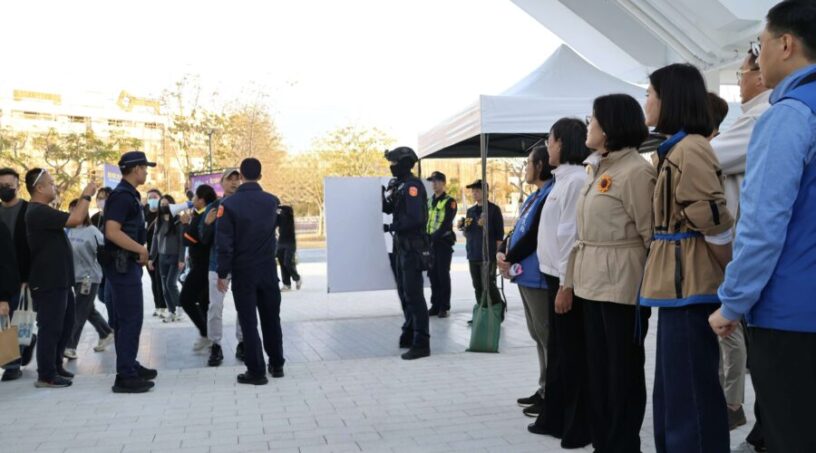 警察局接獲通報,立即出動小區安維組到場,男子不聽制止與警方僵持,在帶隊官口令下,警方立即採取行動,以優勢警力將歹徒制伏並上銬逮捕,帶返警察分局偵辦,現場由特殊警力持長槍接續維安警戒。而因緊急事故導致人員躁動發生推擠,計有5名現場民眾擦挫傷。經警方派員管制傷病患現場並確認安全後,通知現場衛生局醫護站人員及消防局派遣救護人員至現場檢傷病患並進行緊急處置,計中傷2名、輕傷3名,經初步處置後,中傷2名由待命救護車及消防局救護車後送就近醫院治療,輕傷3名傷口處理及登錄相關資訊後自行離開,演練過程緊湊、情境逼真。喚醒文觀、警察、消防、衛生及醫療等相關單位的警戒及做好相關的準備。