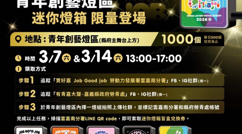 迷你燈箱是由嘉義縣政府勞青處與勞動力發展署雲嘉南分署合作,以分署專屬IP角色「賈好嘉」為主角,結合燈會繽紛視覺,打造「元氣IP」、「潮流復古」、「嘉義聯名」三大風格,並融入「Job Good Job」概念,象徵中央與地方攜手,陪伴青年點亮職涯每一步。