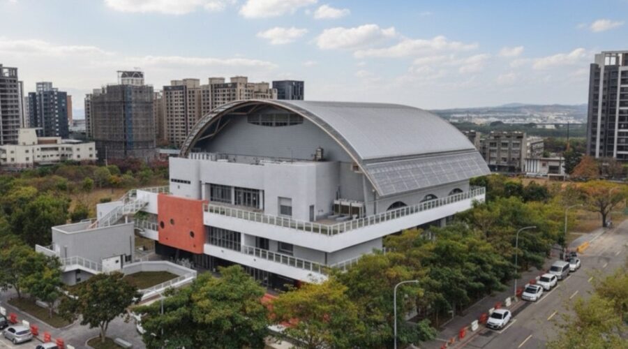 陳局長進一步說明,運動館建築外觀以圓弧屋頂搭配方形外懸廊設計,整體造型宛如一顆暖橘色夕陽,並以局部亮橘色點綴,展現活潑且富有生命力的意象;此外,場館外圍規劃環狀熱身步道,民眾於暖身行走時可遠眺周邊景觀,串聯在地風貌,達到身心放鬆效果。另運動館建築採高標準規劃設計,目標取得綠建築「黃金級」及智慧建築「合格級」標章。