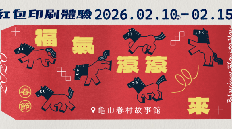 新年將至,龜山眷村故事館於115年2月10日(二)至15日(日)推出春節限定活動《福氣滾滾來—紅包袋印刷體驗》,邀請民眾在新春期間,透過親手印製紅包袋的方式,感受眷村歲時節慶中所蘊含的祝福與人情味。