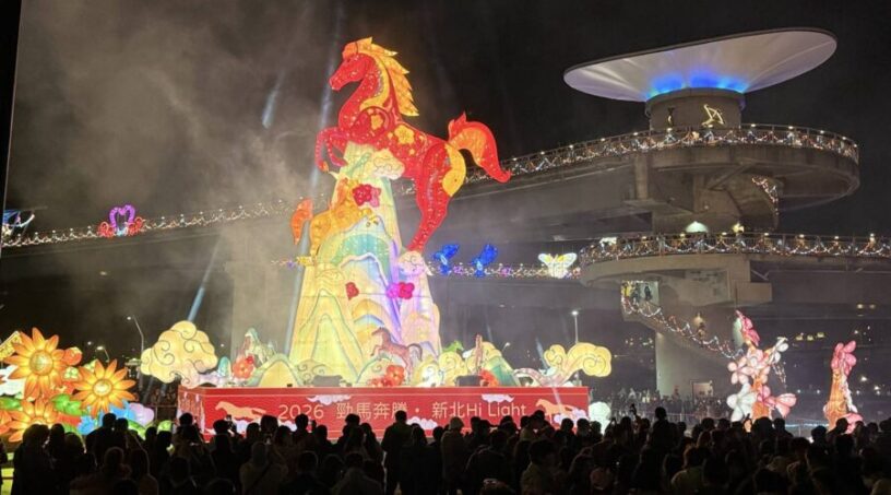 2026新北燈會「勁馬奔騰・新北 Hi Light」,於今(22)日在大都會公園盛大登場,晚間市長侯友宜攜手多位貴賓及韓籍啦啦隊女神安芝儇共同點亮15米360度紅寶馬主燈,巨型駿馬搭配投影、聲光音效,震撼全場,吸引許多民眾搶拍。自2月20日試營運至開幕,新北燈會3天狂吸150萬人潮,賞燈民眾擠爆大都會公園。