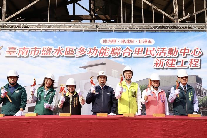 台南市鹽水區岸內里、津城里及月港里三里多功能聯合里民活動中心新建工程今(26)日上午舉行動土典禮,這項工程總經費4,910萬元,預計工期300日曆天。台南市長黃偉哲親臨主持動土,期許工程如期如質完成,為地方打造兼具集會、休閒與社區活動功能的公共空間,提升鹽水區地方生活機能。