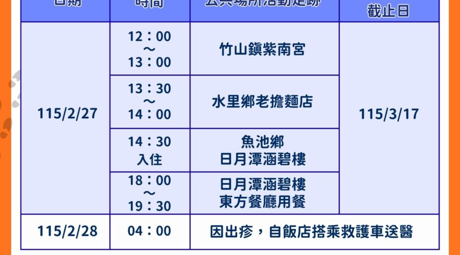 南投縣府衛生局接獲通報,外縣市一名本土麻疹確診者曾於可傳染期間(2月27日至28日)到訪南投,足跡涉及多處公共場域。衛生局立即啟動防疫應變,初步匡列26名接觸者,目前皆無不適。並於第一時間至各活動場域完成清潔消毒與衛教。