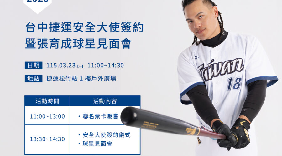 2026世界經典棒球賽(WBC)中讓球迷熱血沸騰的「國防部長」張育成,即將把棒球場上的熱度帶進台中捷運!台中捷運公司宣布邀請張育成擔任年度安全大使,並將於3月23日在捷運松竹站舉辦簽約記者會暨球迷見面會。同日也將限量開賣「張育成icash 2.0聯名卡」,前50名購卡球迷可獲得與張育成近距離合照的機會,預料將吸引眾多球迷粉絲熱情參與。