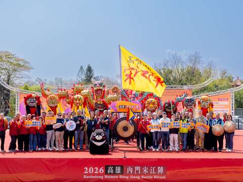 民眾引頸期盼年度盛會,「2026高雄內門宋江陣」今(21)日於內門紫竹寺熱鬧登場!來自內門在地24組文武陣頭盛大集結,以最高規格古禮「青刀巷」列隊迎賓,為活動揭開序幕。開場由「宗興武藝創意宋江陣」、「中埔埤仔墘宋江獅陣」及實踐大學高雄校區越南學生組成的宋江陣隊伍帶來精彩尬陣演出,並由副市長李懷仁進行文武陣頭總點名並頒發藝陣薪傳獎,肯定在地陣頭傳承宋江陣文化的貢獻。活動在李懷仁副市長、內門紫竹寺主委劉銀城與觀光局長高閔琳依序敲鑼後正式宣告開幕;歡迎大家來鬥陣看熱鬧、吃辦桌、齊遶境、遊內門,為期3週,共16天的精彩活動,將帶給大家最豐富的內門在地節慶體驗。