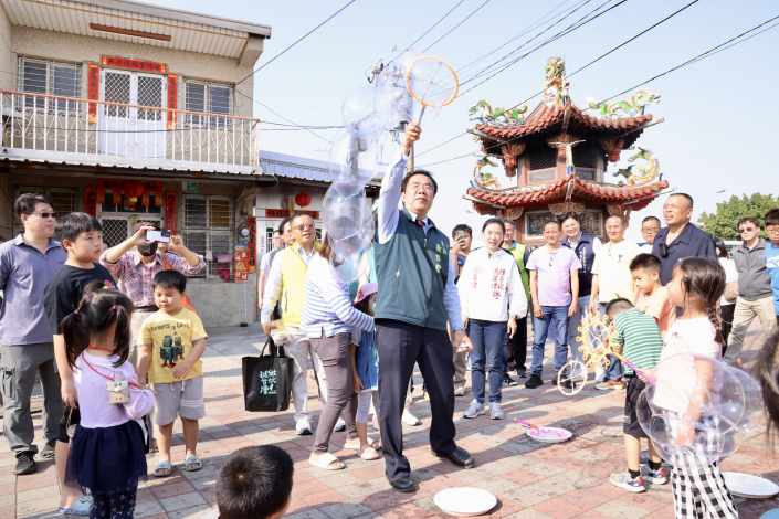 今日活動現場氣氛熱絡,黃偉哲也親自走入人群,與現場小朋友一同體驗泡泡互動,在繽紛泡泡飛舞中開心合影,展現與民同樂的親切一面,為活動增添溫馨歡樂氛圍。
